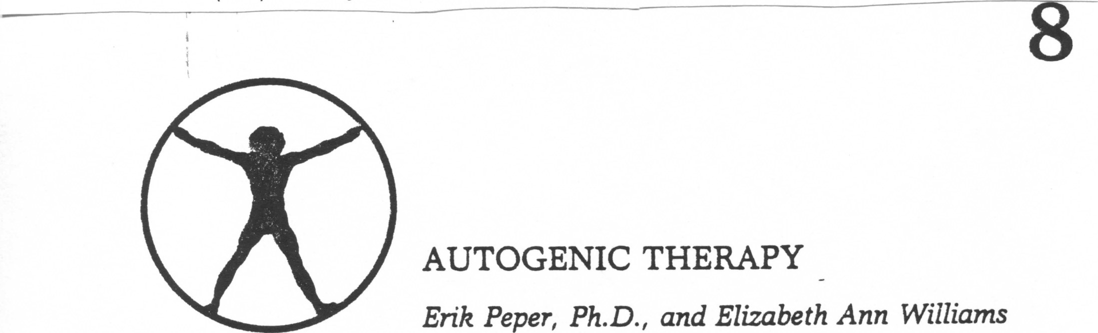 Peper, E. & Williams, E.A. (1980). Autogenic Therapy. In: Hastings, A.C., Fadiman, J. & Gordon, J.S. (Eds.). Health for the Whole Person. Boulder: Westview Press, 131-137.